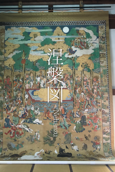 當山の涅槃図は縦五メートル三十センチ、横三メートル九十センチもの大涅槃図で、本山のような大寺院を除けば一般の寺院としてこれだけ大きな涅槃図を所蔵しているのは極希なことであります。