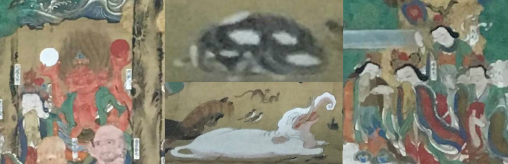 さまざまな生き物たち | おそらくこの絵図が描かれた当時に見られたほどんどの動物、昆虫がとてもリアルに描かれ、さらに麒麟や龍、玄武といった架空の動物も登場しています。中でも注目すべきは、江戸時代の絵師たちはおそらく実物を見ていないはずの、白象やひょう、ラクダなどの猛獣類も描かれています。なお、當山の涅槃図にもちゃんと猫も描かれています |