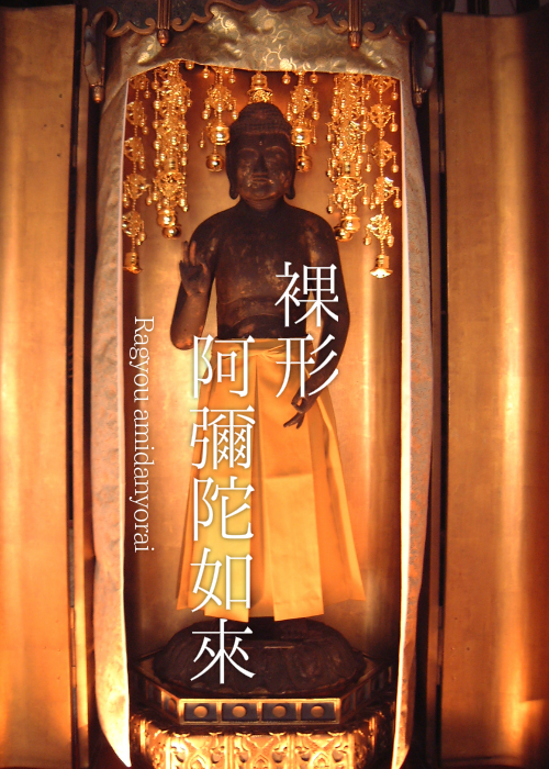 世にも類い希れなる裸形童容の阿彌陀佛にして、其の御丈三尺餘、名工賢問子の作なり。此の尊像の由来を尋ぬるこそ、げに又となく尊とけれ。今を去る千二百七十餘年の昔、人皇第三十五代に當たり給へる 皇極天皇は御女性にてぞ御座しけるが、未だ 舒明天皇の皇后として在ませし時、御子あらせざりければ常に深く之を嘆き給ひ、はるばる春日の明神を後宮に請来して、日夜に皇子御生誕の御祈請を籠め給ふ程に、神明の加護空しからず程なく御懐妊遊し給ひき。然るに陰陽の博士、僧達、謹んで之を相し以て奏すらく、御生誕の御子は必ず皇女におはすらんとありければ、皇后喜びの中にも嘆を加へての給はく、吾れ嚮きに子を祈りしは、天津日嗣の皇子を得んが為なりき。仰ぎ願わくば神明擁護の力を以て此の皇女を皇子と転ぜしめ給へと。更に三七日の祈願を込め給ひぬ。あはれ之れ程の念誦法楽も今ははや今宵限りぞと更に至誠を捧げ給ふ内に、夜もやうやうに更け渡り、玉燈のかげもさすがに仄かに薄れ行けり。皇后も日頃の御疲れにや覚えず、しばしまどろみ給ふ折しもあれ、春日の明神、皇后の御座近く現はれて告げ奉らく。君が願ひさこそにあらめ、幸なるかな西方阿彌陀佛の四十八願の中に變成男子の大願あり。かゝる願ひこそ彼の阿彌陀佛ぞよけれ吾れ又本地の威力を借り御身代りとなりて彼の佛を勧招し奉らんと、明神親しく西方に向ひ、合掌帰命し奉らるゝに、不思議なるかな光明赫々たる内に裸形童容の阿彌陀佛現はれ給ひ、皇后の御口に入り給ふと覚えて御夢醒めにけり。斯くて少しの悩みもなく御安産遊ばされし皇子こそ後に 天智天皇と名け奉るなり。されば皇后の御感斜めならず、夢中化現の尊像を模し奉り、以て皇子の御守本尊となさばやと思召し、親しく名工賢問子を召して御夢告の儘を語り給ひ、献上せしめられたる御尊像こそ此の裸形の阿彌陀佛にて在します。されば其の後 天地天皇之を御守本尊となし給ひ、其の他 天武天皇 持統天皇等、相ひ次ぎて護持し給ひ、常に後宮に安置し奉りて朝暮の御勤め怠らせ給はざりきとなん。世に安産守護の本尊裸形阿彌陀如來とて霊感殊に験たかなりけり。