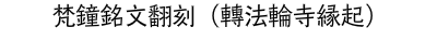 獅子吼山轉輪寺は吉水の嫡流、鎭西正宗の道場にして、專修淨業弘通の導師、關通上人の創建せらる所なり。まづこの上人、賀茂川西三株樹に一つの精廬を構え、法流大いに響き、聲長秋に逹す。 ここに於いて、前の典侍、從三位藤原保の子(法號、即心院巻光慧倫法尼)恭しく奉り、女院の命により屡講筵に列し、遂に專修法門に歸す。 維時、寛延改元の秋、自ら願主となってこの寺にて常行念佛を修せしむ。葢し、奉りて櫻町院冥福の爲と云ひて、乃ち、恭しく奉りて神牌を佛殿に安きて、申命として、永代を以て當に追薦の旨を奉修すべし。因って黄金若于を賜り、以て念佛不退轉の資を充つる。金湯外護の檀越と謂う可きなり。爾来、化縁彌盛んにして、道俗四衆靡然として風に嚮ひ、或いは一朝に薙染出家して来たり止まる者、亦た多からずといえず。 唯だ恨らくは、寺境狹隘にして、以て徒衆を容れるに足らず。故に更に復た斯地を經營す。葢し斯地、歡喜山圓通寺の址にして、しかも寺は舊と西賀茂邑に在り。故有って、近く茲の地に移り、しかも堂宇未だ成ぜず。上人偶之を見て、其の因縁を審にす。以て相國禪寺慈照院に之を請ひて、寶暦丙子の春、遂に其の允許を得て、以て乃ち禪苑を轉じて永く淨業道場と為すと官に告ぐ也。 參州岡崎矢作郷に井上某者有り。父子共に信を三寶に寫し、乃ち淨資を喜捨するを以て新たに興起の基を開く。願主、彌陀如来丈六の尊像を安置して莊嚴美を盡せり。是に於いて、東西兩寺、互いに其の號を易えて、彼を轉じて圓通寺と為し、此を改め轉輪寺と為す。 乃ち洪鐘を鑄る。其の形量、竪九尺は則ち九界の衆生を濟度するに擬らし、横四尺二寸は則ち四十二位の取證を表して、以て法筵の具とす。 其の銘に曰わく。 鳬の功工、成じて新たに法筵に架かる。 夕べに月樓に響き、曉に霜天に鳴る。 九乳道を得て、十方眠て覺す。 清淨允に淑く、俗累那ぞ善を牽かんや。 菩提の大哉、福田の錫、文思は武し。 聖化は偏り無く衆を濟いて度生せしめ、 法流は塞ぎて寶噐を潤し、南山萬年に朽ちず。 寶暦十四年正月十五日 從三位行右大辨菅原朝臣在家 撰併書