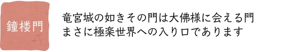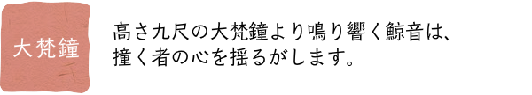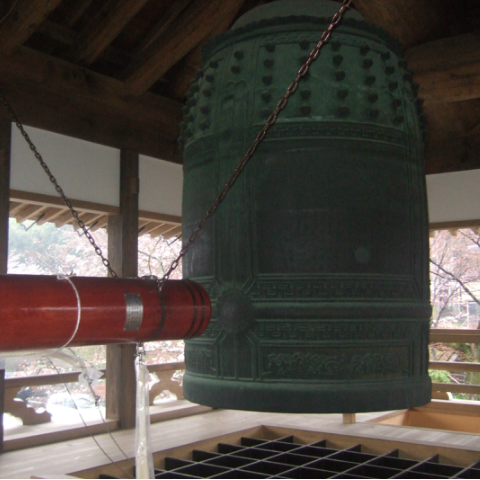 樓門階上に懸かる洪鐘は洛陽中有数の名鐘にして、宝暦十四年(1764)畏くも櫻町天皇御菩提の爲に鋳造せらるもの、其の突き初めの盛儀は即心院殿親しく行はせらる、形状を見るに竪の九尺は則ち九界の衆生濟度に擬し、横の四尺二寸は則ち菩薩四十二位の取證に模す、從三位右大辨菅原朝臣在家卿其の鐘銘の中に書して曰く