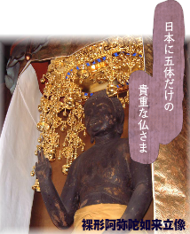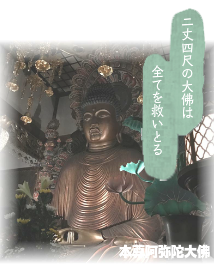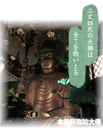 當山のご本尊は阿弥陀如来座像です。その身の丈、二丈四尺(約七・五メートル)の大佛さまです。木造の座像佛としては京都一の大きさです。この大佛様の前に座ってお参りすれば、全ての悩みを聞き入れてくださいます。